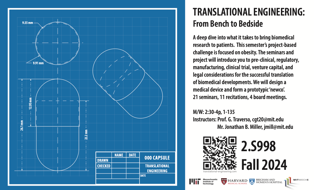 Some of the most exciting and impactful engineering work involves the translation of new healthcare technology from the benchtop to the bedside. Participants explore healthcare technology translation by focusing on an active medical challenge associated with obesity. This course is seminar and project-based to provide hands-on experience into the needs at each stage of biomedical development, including pre-clinical, regulatory, manufacturing, clinical trial, venture capital, and legal considerations. The course project runs the entire duration of the semester and involves the creation of a prototypic new company focused upon the development and translation of a medical device. This course provides an opportunity to experience the architecting of a new company and the steps toward successfully launching and commercializing a medical technology with guidance from national leaders. Seminars are delivered by startup executives, government leaders, patent lawyers, MIT entrepreneurs and professors, journal editors, and foundation directors. Topics offer a comprehensive view of medical technology commercialization including clinical trial design, stakeholder analysis, and intellectual property strategy.